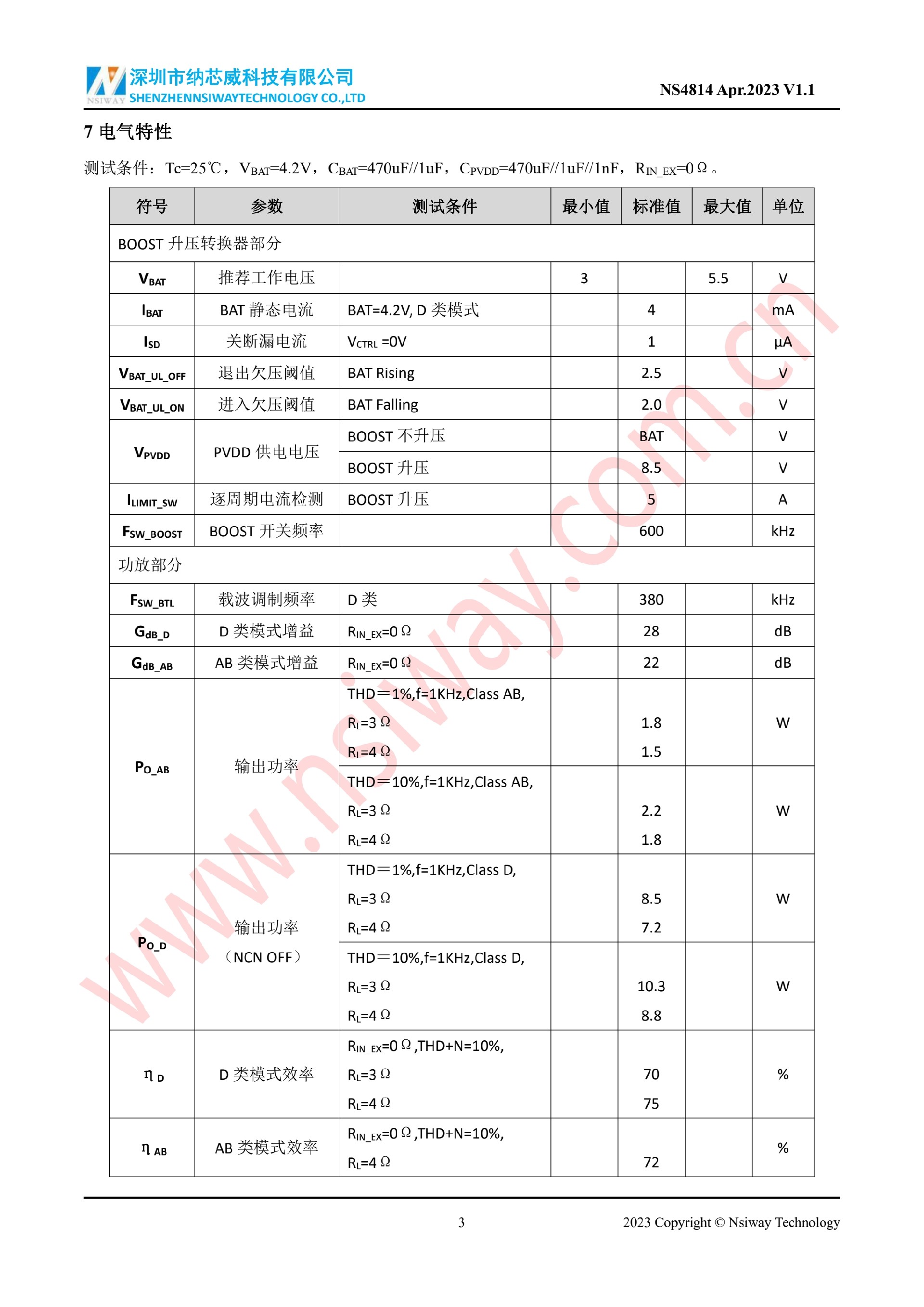 NS4814 單聲道AB/D 類音頻功率放大器(內置BOOST升壓和NCN功能)